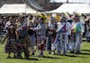 Native American dancers finish the first session of dancing at the IU 7th Annual Traditional Powwow in Dunn Meadow on Saturday. Dancers and audience members participated in festivities throughout the day.