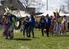 Native American dancers and members of the powwow committee dance hand-in-hand at the IU 7th Annual Traditional Powwow on Sunday, April 7, in Dunn Meadow. The event attracted members of the Native American community from across the country.