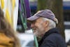 Bloomington resident Jeff Irving listens to Stanley Njuguna give opening remarks Wednesday, March 28. Irving was one of over 50 people who marched on city hall to protest the purchase of an armored vehicle for the Bloomington Police Department.