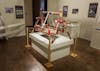 A colorful child’s cradle sits in the center of the Snapshot of Pakistan exhibit at the Mathers Museum. The cradle was made through a labor intensive process which includes shaping the wood on a lathe and then applying various layers of color before the artist etches in a design of their choice.
