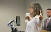 Ann Boehm sits at Bloomington Bagel Company Wednesday morning.