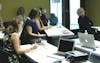 Members of Students Against State Violence discuss in small groups at Sunday's meeting in the Neal-Marshall Grand Hall.