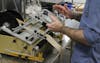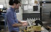 Justin Hughuy uses a filler to fill each bottle proportionally. After being filled the bottles move onto the packaging phase.