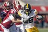 Freshman wide receiver Duwyce Wilson jumps acrobatically over Iowa's Brett Greenwood during IU's 18-13 loss to the Hawkeyes on Saturday at Memorial Stadium.