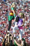 Cheerleaders wearing Halloween costumes perform stunts during IU's 20-17 loss to Northwestern on Saturday at Memorial Stadium.