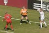 Freshman defender Lara Ross heads the ball off the line after a shot by Ohio State's Paige Maxwell during IU's 1-0 win against the Buckeyes on Sunday at Bill Armstrong Stadium.