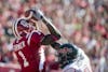 Arkansas State wide receiver Anthony Robinson stumbles after being hit by Indiana's Leon Beckum during IU's game against the Red Wolves on Saturday at Memorial Stadium.