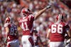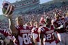 Junior tight end Max Dedmond reacts after scoring a touchdown during IU's 36-34 win against Arkansas State on Saturday at Memorial Stadium.