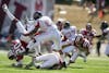 Defensive back Lawrence Barnett is upended by Arkansas State defenders during IU's game against the Red Wolves on Saturday at Memorial Stadium.