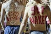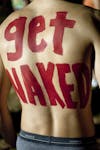 Freshman Mike Bobson stands with his back painted before running the Nearly Naked Mile Monday in Dunn Meadow.