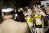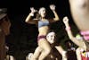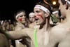 Freshman Roxanne Schrock dances on a friend's shoulders before the start of the Nearly Naked Mile Monday in Dunn Meadow.
