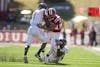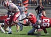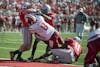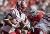 Arkansas State wide receiver Anthony Robinson stumbles after being hit by Indiana's Leon Beckum during IU's game against the Red Wolves on Saturday at Memorial Stadium.