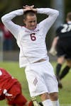 Junior midfielder Chris Estridge reacts after missing a chance to score during IU's 1-1 draw against Wisconsin Sunday at Bill Armstrong Stadium.