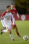 Senior midfielder Andy Adlard passes forwards during IU's 1-1 draw against Wisconsin Sunday at Bill Armstrong Stadium.