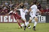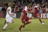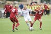 Freshman forward Rebecca Candler and freshman midfielder Lisa Nouanesengsy disposess Wisconsin's Meghan Flannery during IU's 1-0 overtime loss to the Badgers on Sunday at Bill Armstrong Stadium.