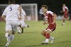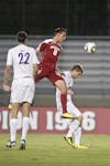 Freshman midfielder Nikita Kotlov attempts to head the ball towards goal during IU's 1-0 win against Evansville Wednesday at Bill Armstrong Stadium.