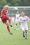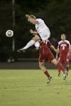 Freshman forward Rebecca Candler wins a header during IU's 1-0 overtime loss to Wisconsin on Sunday at Bill Armstrong Stadium.