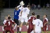 Evansville forward Taylor Parker challenges IU's Jacob Bushue for a header during IU's 1-0 win against the Purple Aces Wednesday at Bill Armstrong Stadium.