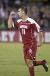 Junior forward Will Bruin celebrates his goal during IU's 1-0 win against Evansville Wednesday at Bill Armstrong Stadium.