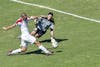 Freshman midfielder Becca Zambon (19) tackles Wisconsin's Leigh Williams during IU's 1-0 overtime loss to the Badgers on Sunday at Bill Armstrong Stadium.