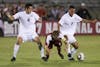 Senior forward Andy Adlard (center) is fouled by Cal's Anthony Avalos during IU's 2-1 loss to the Golden Bears Friday at Bill Armstrong Stadium.