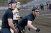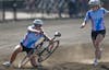 Alpha Delta Pi riders grimace as they lose control of the bike curing an exchange during qualifications March 27 at Bill Armstrong Stadium. Alpha Delta Pi qualified 32nd with a time of 3:14.10.