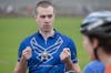 Air Force men's team captain and women's team coach Kevin Skelton discusses qualification-day strategy with Air Force riders during track practice March 24 at Bill Armstrong Stadium.