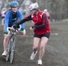 Air Force rider Cassie Luhrsen takes the bike from teammate Ashley Doyle during track practice March 24 at Bill Armstrong Stadium.