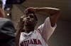 Senior guard Devan Dumes replaces a lost contact lens during IU's 88-80 win against Northwestern March 6 at Assembly Hall.