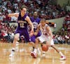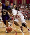 Senior guard Devan Dumes knocks the ball away from Northwestern's Luka Mirkovic during IU's 88-80 win against the Wildcats March 6 at Assembly Hall.