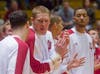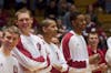 Freshman forward Derek Elston reacts with teammates during senior day celebrations after IU's 88-80 win against Northwestern March 6 at Assembly Hall.