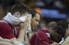 Freshman forward Bobby Capobianco wipes his face with a towel after fouling out of the game during IU's 73-57 loss to Iowa Feb. 28 at Carver Hawkeye Arena in Iowa City.