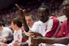 Senior center Tijan Jobe motions to the crowd during IU's 88-80 win against Northwestern March 6 at Assembly Hall.