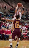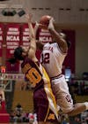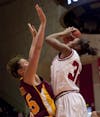 Senior guard Jamie Braun shoots over Minnesota's Brittany McCoy during the Hoosiers' 59-50 loss to the Golden Gophers Sunday at Assembly Hall.