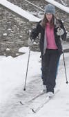 A student skis outside the Indiana Memorial Union Monday. Bloomington was hit with several inches of snow, with flurries continuing through Monday evening.