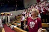 IU professor and Grammy-winner Sylvia McNair dances along to a video presentation before singing the National Anthem during Indiana's contest against Minnesota Sunday at Assembly Hall.