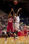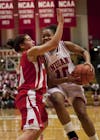 Sophomore guard Verdell Jones and freshman forward Bobby Capobianco challenge for a rebound during IU's 69-45 loss to Michigan Jan. 14 at the Crisler Arena in Ann Arbor, Mich.