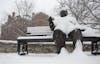 Snow falls on a bronze statue of former IU President Herman B Wells Thursday near the Old Crescent. The Midwest was blanketed with snow days before students, staff and faculty are due to resume classes.
