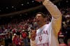 IU center Bawa Muniru goes up for a dunk Friday at Hoosier Hysteria. IU coach Tom Crean put his team through it's first practice of the season in front of an enthusiastic Assembly Hall crowd.