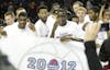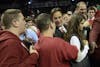 Team members smile as they hold up their winners' banner after the Hoosiers' won the Progressive Legends Classic on Tuesday at Barcalys Center.