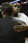 Junior Victor Oladipo hugs Tom Crean after being awarded the trophy at the Progressive Legends Classic on Tuesday at Barclays Center in Brooklyn.