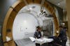 Radiation therapists Kaitlin Kuhn and Andrew Beaver prepare the room housing one of the IU Proton Therapy Center's proton beams for a patient. Proton therapy is a very precise way to rid the body of cancer cells and is a form of external beam radiation treatment.