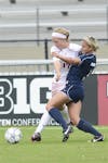 Senior midfielder Devon Beach crashes into Carly Niness of Penn after heading the ball during the Hoosiers' 3-0 loss to Penn Sunday at the Bill Armstrong Stadium.
