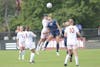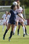 Senior forward Carly Samp and Penn defender Lexi Marton simultaneously head the ball during the Hoosiers' 3-0 loss to Penn Sunday at the Bill Armstrong Stadium.