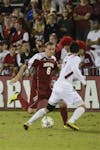 Freshman midfielder Jordan Woolums fights for the ball during the Hoosiers' 3-0 loss to Penn Sunday at the Bill Armstrong Stadium.