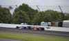Takuma Sato driving car 26 passes Tony Kanaan in car ten. Sato finished in first place, and Kanaan finished in fifth.