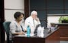 Elizabeth "Lee" Jones and Geoff McKim give their opening statements at the county council debate at the Monroe County Public Library Wednesday night.