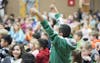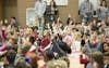 Students at Rogers Elementary raise their hands for the Martin Luther King Day celebration Thursday night. The students performed songs and honored community members for their service.