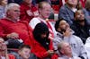 Indiana football senior wide receiver Elijah Sarratt smiles toward the jumbotron during a women's basketball game against Butler on Nov. 19, 2025, inside Simon Skjodt Assembly Hall in Bloomington. The crowd cheered for Sarratt after spotting him in the crowd.