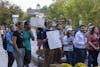 IU graduate workers hold a sign at Presidents Hall during a Bloomington Faculty Council meeting on April 18, 2023. Graduate workers are asking for a 8% cost of living increase.